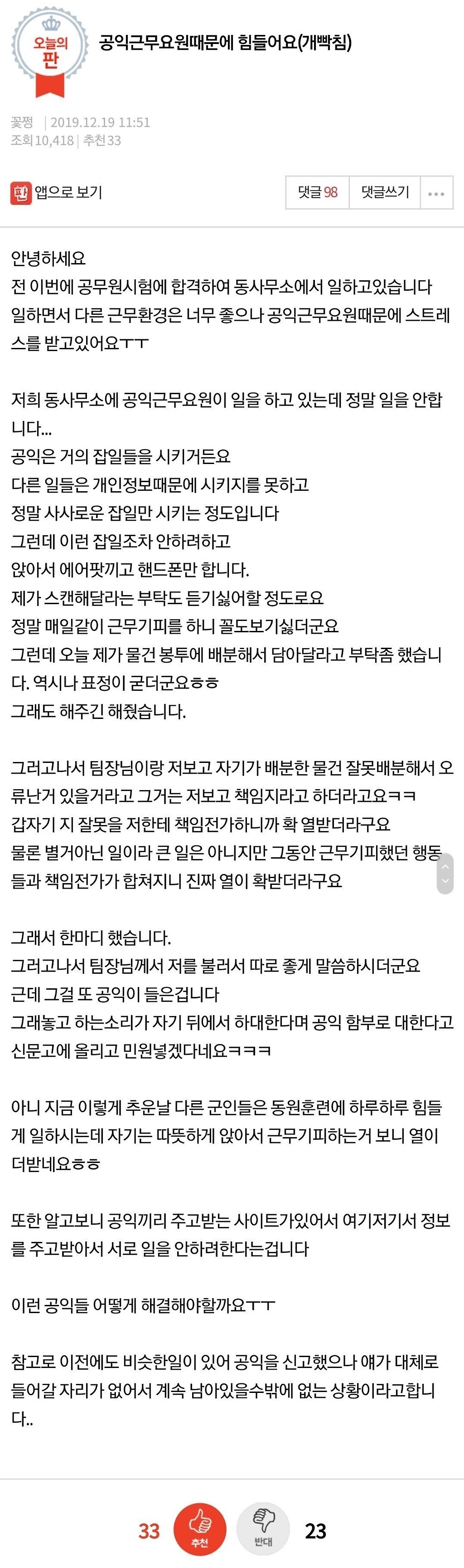 어제 오전에 네이트판에 말안듣는 공익때문에 힘들다는